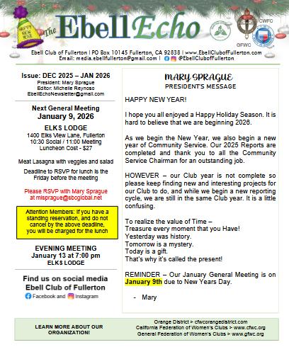 Newsletter Click on Newsletter to view in PDF format. 2025 Ebell Echo Newsletters December 2025 – January 2026 November – December 2025 October – November 2025 September – October 2025 August – September 2025 Summer 2025 June 2025 May 2025 April 2025 March 2025 February 2025 January 2025 2024 Ebell Echo Newsletters December 2024 November 2024 October 2024 September 2024