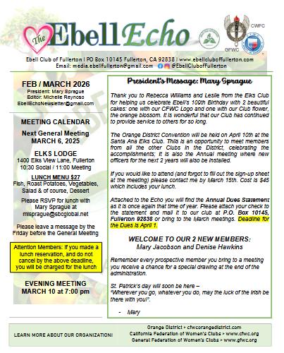 Newsletter Click on Newsletter to view in PDF format. 2026 Ebell Echo Newsletters February 2026 January 2026 2025 Ebell Echo Newsletters December 2025 – January 2026 November – December 2025 October – November 2025 September – October 2025 August – September 2025 Summer 2025 June 2025 May 2025 April 2025 March 2025 February 2025 January 2025 2024 Ebell Echo Newsletters December 2024 November 2024 October 2024 September 2024